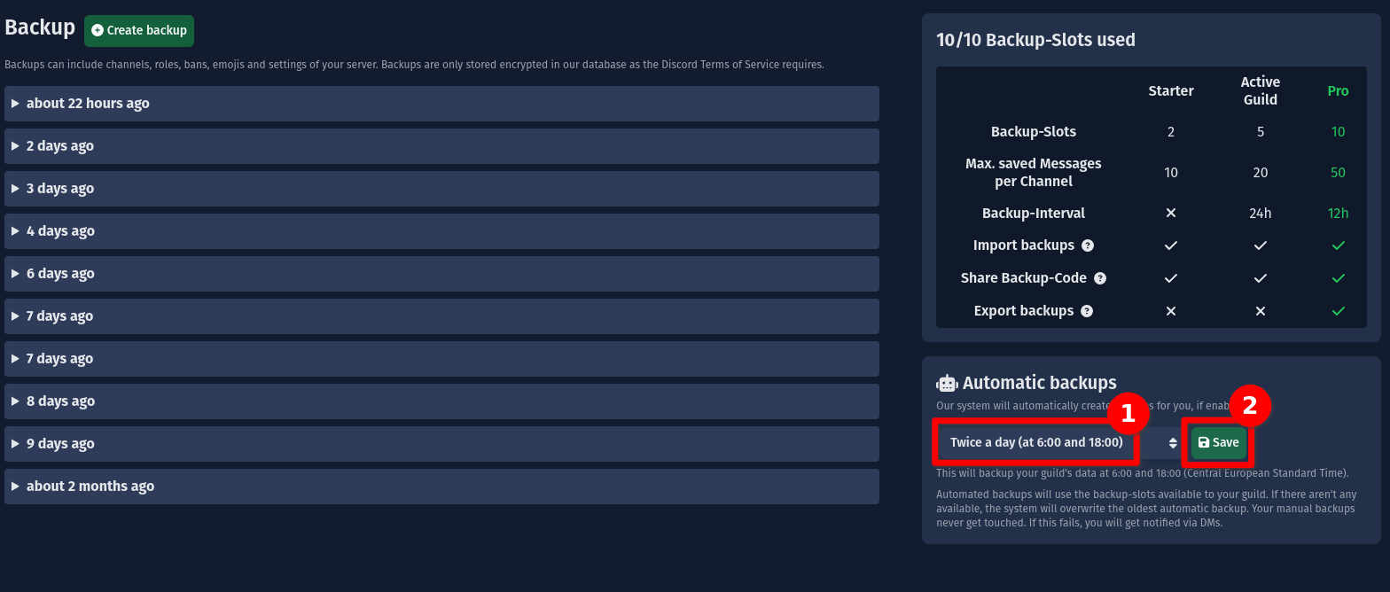 | Servereinstellungen | Backups werden Server-Namen, -Icon, -Einstellungen (wie den AFK-Kanal), Auto-Moderations-Regeln und mehr beinhalten. |
