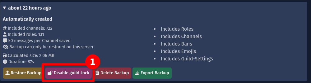 - Server-Sperre deaktivieren / aktivieren: Erlaubt / Verbietet die Wiederherstellung deines Backups auf anderen Servern. Im Abschnitt Backups auf anderen Servern wiederherstellen kannst du mehr darüber erfahren.