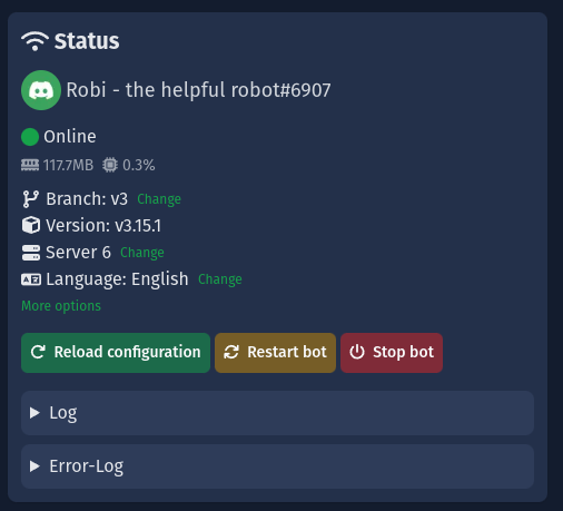 • "Bot neustarten": Dies wird den Prozess deines Bots neustarten. Dies wird eventuell einige Minuten in Anspruch nehmen, zusätzlich wird der Bot für eine kurze Zeit offline sein, in welcher der Bot nicht erreichbar sein wird. Du solltest deinen Bot nur neustarten, wenn du dazu aufgefordert wirst, seltsame Fehler auftreten oder du ein Update durchführen willst.
